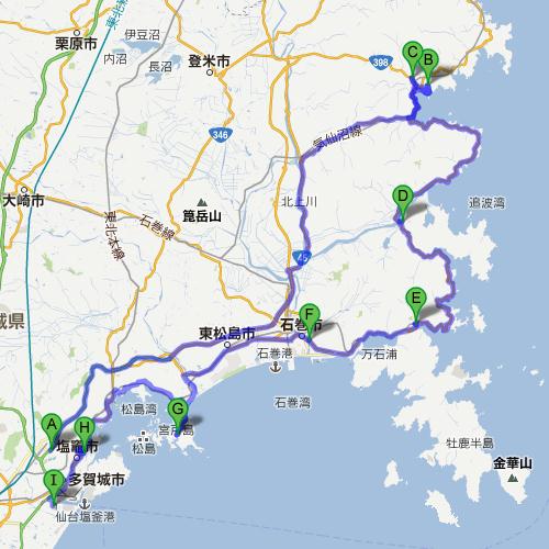 前半戦は三陸道で一気に北上、志津川(B防災対策庁舎跡、C仮設商店街)、雄勝(D大川小学校跡)、E女川市街、F石巻市街、G奥松島、Hマリンゲート塩釜、I仙台港と見て回ってきました。