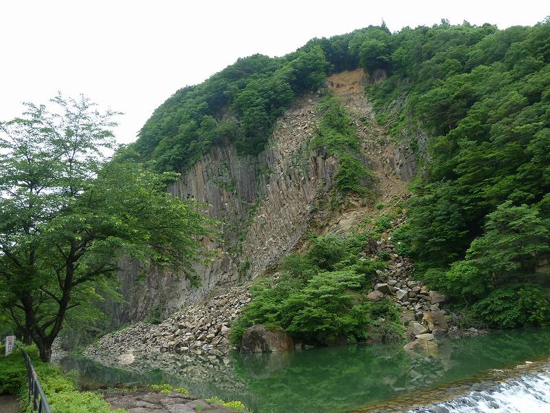 同じく「やくせん」の近くにあった「材木岩公園」です。材木岩というのは、名前の通りの奇岩でなかなか面白いのですが、近づこうと思ったらなぜか進入禁止になっており、遠くからしか見られなかったのが残念でした。地震の対応が、まだ済んでないって事なんでしょうか……
