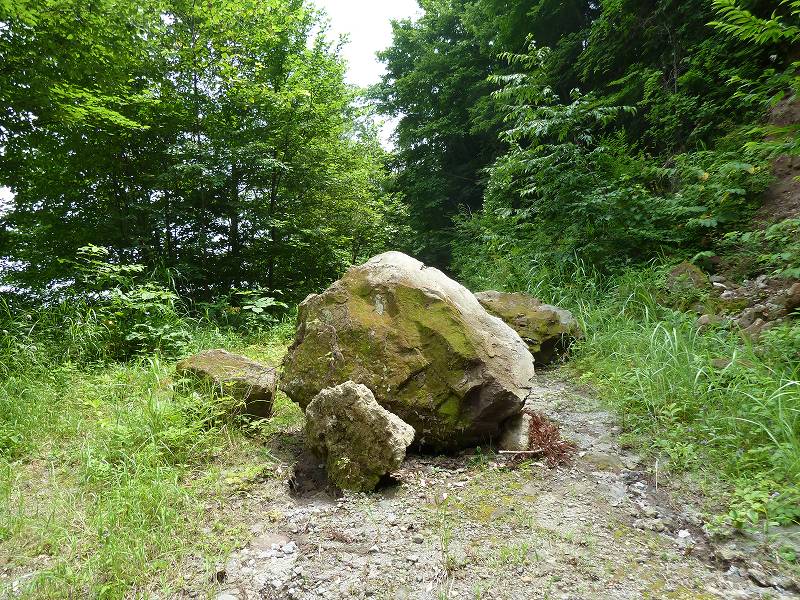 近寄ってもう1枚撮影してみました。道のどまんなかにでっかい石が鎮座している状態を見たというのは、生まれてこのかた初めてです、驚きました。結局再び スーパー悪路を引き返す事となり、Mさんの車はどこかをこすったのか、しばらく「シャシャシャシャ……」とセミが鳴くような異音を立てて走る状態となって しまいました。帰宅寸前には音はなくなったものの、大丈夫か心配です。