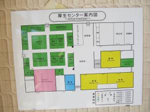 厚生棟の案内図です。食堂、売店(コンビニ含む)の他、床屋さんとか喫茶店とかもあるんですね。大学にある厚生棟と似たような感じです。