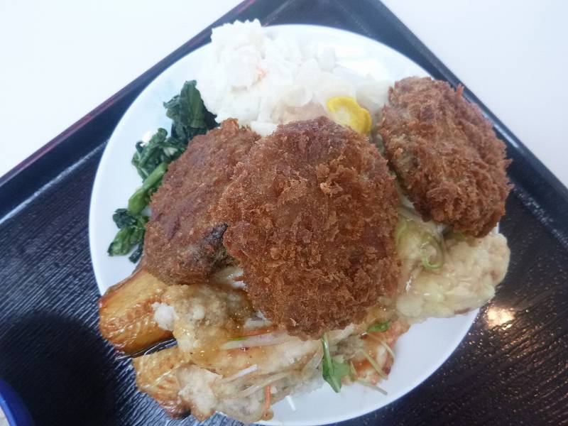 私の盛りはこんな感じでした。揚げ物はちょっと温度が下がっていて、いまいちでしたね……。焼き魚とおひたしが良かったです。