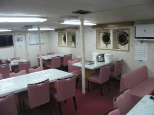 船仕事での数少ない楽しみ・食事ですが、蒼鷹丸では2~3人の専任の人がいて(「司厨員」といいます)おいしい食事をつくってくれます。1食400円と社員食堂や学食並のお値段ですが、それらと比べると1ランク上の食事が楽しめます。水産研究所の船だけあって、魚料理が充実しています。汁物は魚介類でしっかり出しを取っている時があり、この時の味は並の食堂の汁物のレベルではありません。うまいですよ!