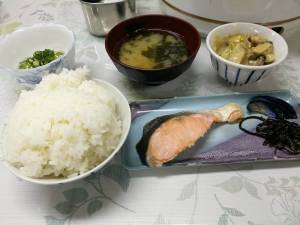 朝食/夜食です。勤務が遅番、夜勤の場合、朝食の分を夜勤に回す事となります。昼夕と比べおかずが少ないですが、夜食だと夕食で余ったおかずをもらえる時があり、ちょっとお得……かもしれません。