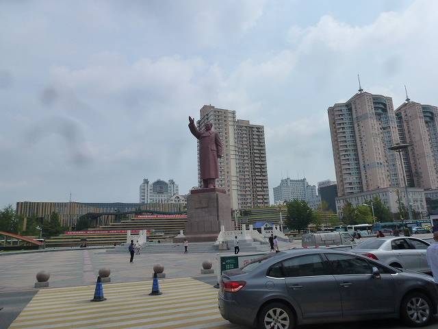 丹東駅前にはでっかい毛沢東の像が…… 北朝鮮との国境の街であり、朝鮮戦争での中国軍(人民解放軍)の活躍を示す街、って事なんでしょうね。